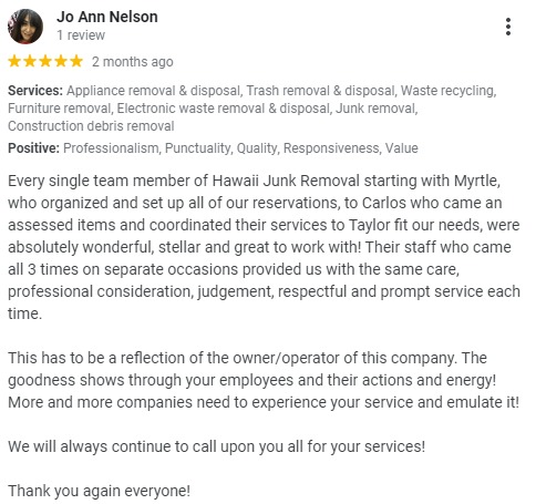At Hawaii Junk Removal, we take pride in providing the highest level of customer service. Our team will work closely with you to understand your needs and develop a customized plan that fits your specific requirements. We're committed to making sure that every client is completely satisfied with our services, and we'll go above and beyond to exceed your expectations.